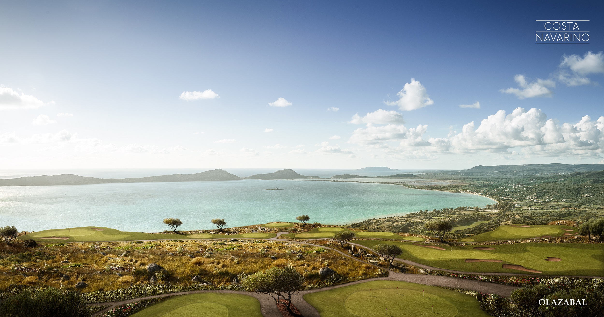 Designed by two-time Masters champion and Ryder Cup legend José María Olazábal, the two new courses will both play to par 72 and measure 6,466m and 6,280m respectively and stretch over 125 hectares (1,250,000sq.m.), overlooking the historic Bay of Navarino and the surrounding hills.