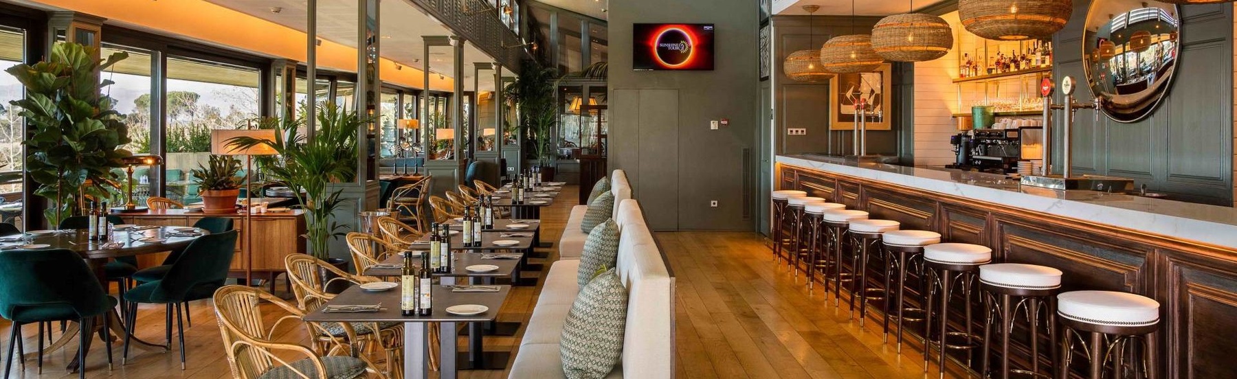 Expansive glass walls, well-placed mirrors and the bright foliage of a legion of indoor plants create a light-drenched space that opens out onto the stunning Stadium Course, Spain’s #1 golf course*. Wooden tones blend with sage green upholstery and tan leather to create a warm, natural atmosphere that plays contrast against the clean lines of marble, metallic, and charcoal-grey surfaces.