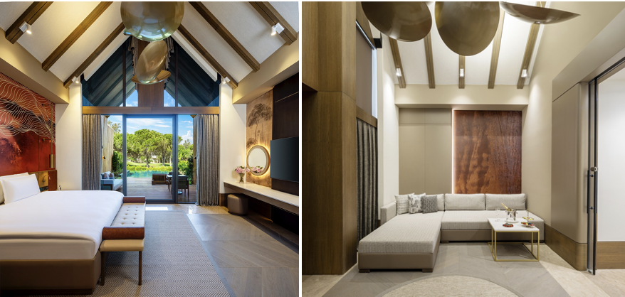 With direct access to the Lagoon Pool from each terrace, beautiful golf course views and green surroundings as well as stylish wooden architecture, these villa style accommodations can be easily reached over a wooden bridge from the hotel lobby. The Lagoon Suites feature a bedroom, living room, powder and dressing room, large bathroom and a private deck with loungers so guests can enjoy nature in blissful surroundings. Interior designer Tre Tasarim has chosen warm colour schemes like stone grey, wooden brown and orange to create a serene and contemporary ambiance for golf and leisure travellers, couples or small families alike.