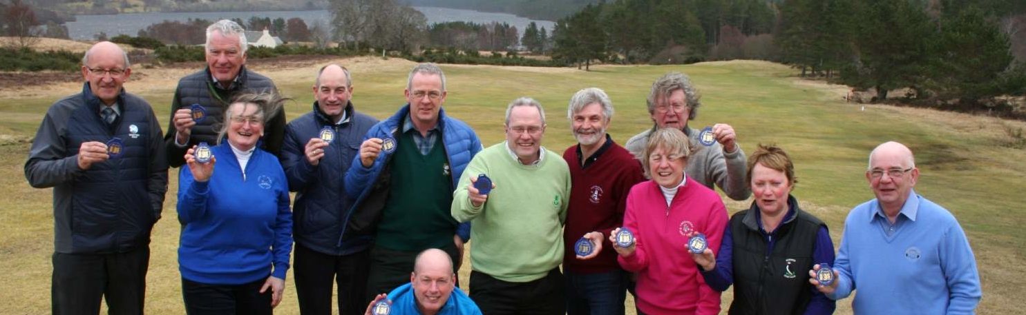 Top: Pictured with the High 9s bag tag are (from left) Willie MacKay, Scottish Golf; John Gunn, Lybster Golf Club; June Sanderson, Isle of Skye Golf Club; Neil Hampton, Chair, Golf Highland; Phil Masheter, Aigas Golf Course; John Swinden, Abernethy Golf Club (kneeling); Allan Perris, Gairloch Golf Club; Barney Mackie, Portmahomack (Tarbat) Golf Club; Mike Turner, Ullapool Golf Club (back); Susan Swinden, Abernethy Golf Club; Lucy Mackay, Durness Golf Club; and Albert Tonge, Bonar Bridge & Ardgay Golf Club