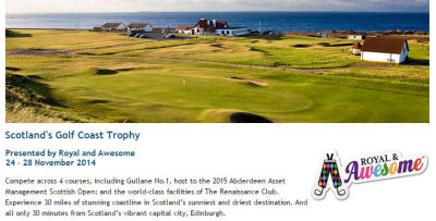 Commencing on Monday 24th November, the week starts off with a stiff challenge at Gullane No. 1, home of the 2015 Aberdeen Asset Management Scottish Open; followed by a visit to Dunbar Golf Club, an Open Championship Qualifying Course; before tackling Londniddry Golf Club’s mix of links & woodland; and concluding at the exclusive Renaissance Club on Friday the 28th November 2014.