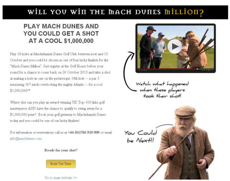 From 15 July through 15 October 2013, individuals who register and play an 18-hole round at Machrihanish Dunes Golf Club will be entered into a set of random drawings that will determine four finalists to shoot for the “Mach Dunes Million” on 26 October 2013.
